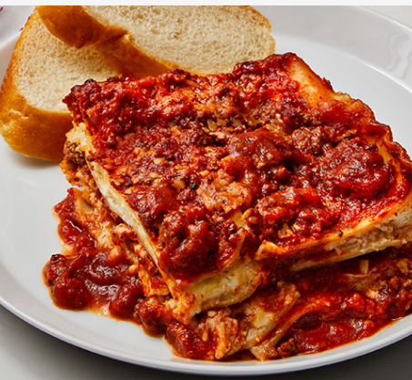 Layers of meat sauce, pasta and cheeses baked together in deliciousness.