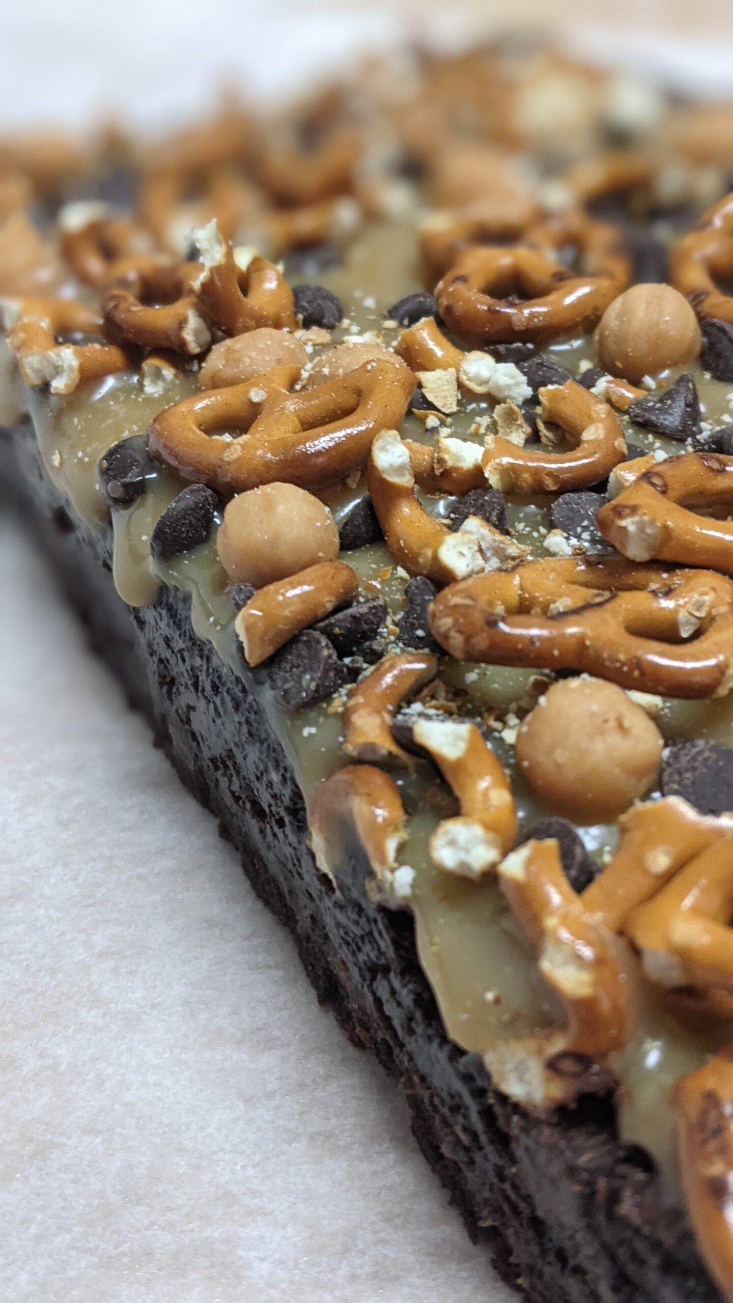 8×8 pan of Chocolate brownies filled with Caramel and topped with more caramel, pretzels, and chocolate chips. Gluten Free too!!